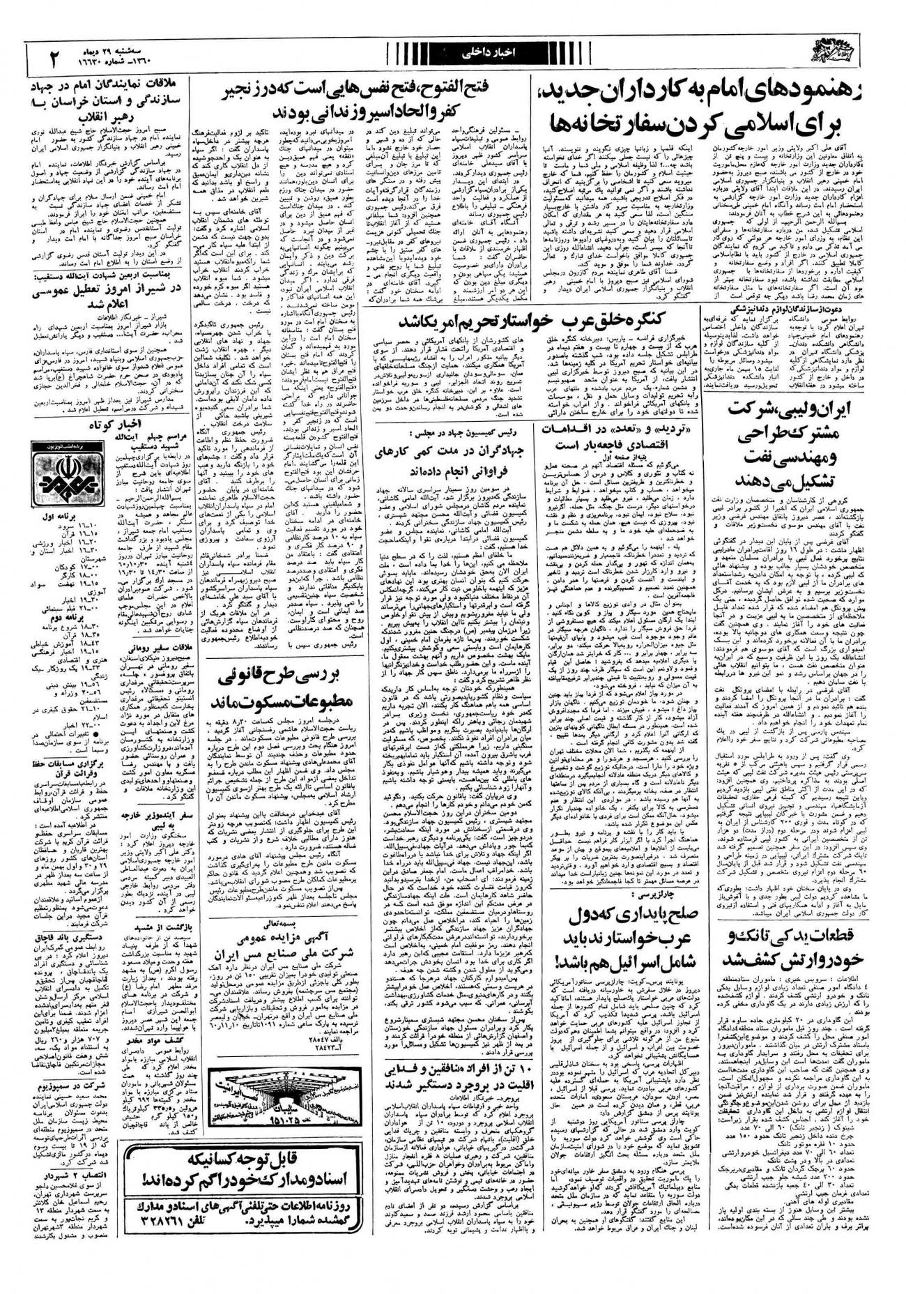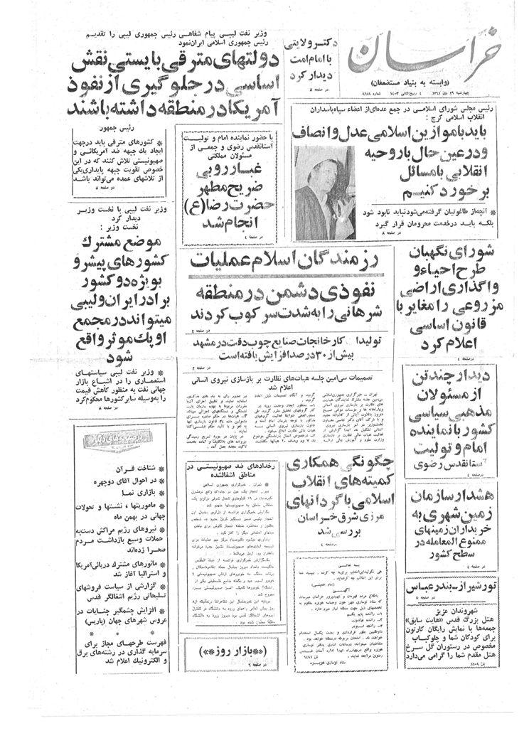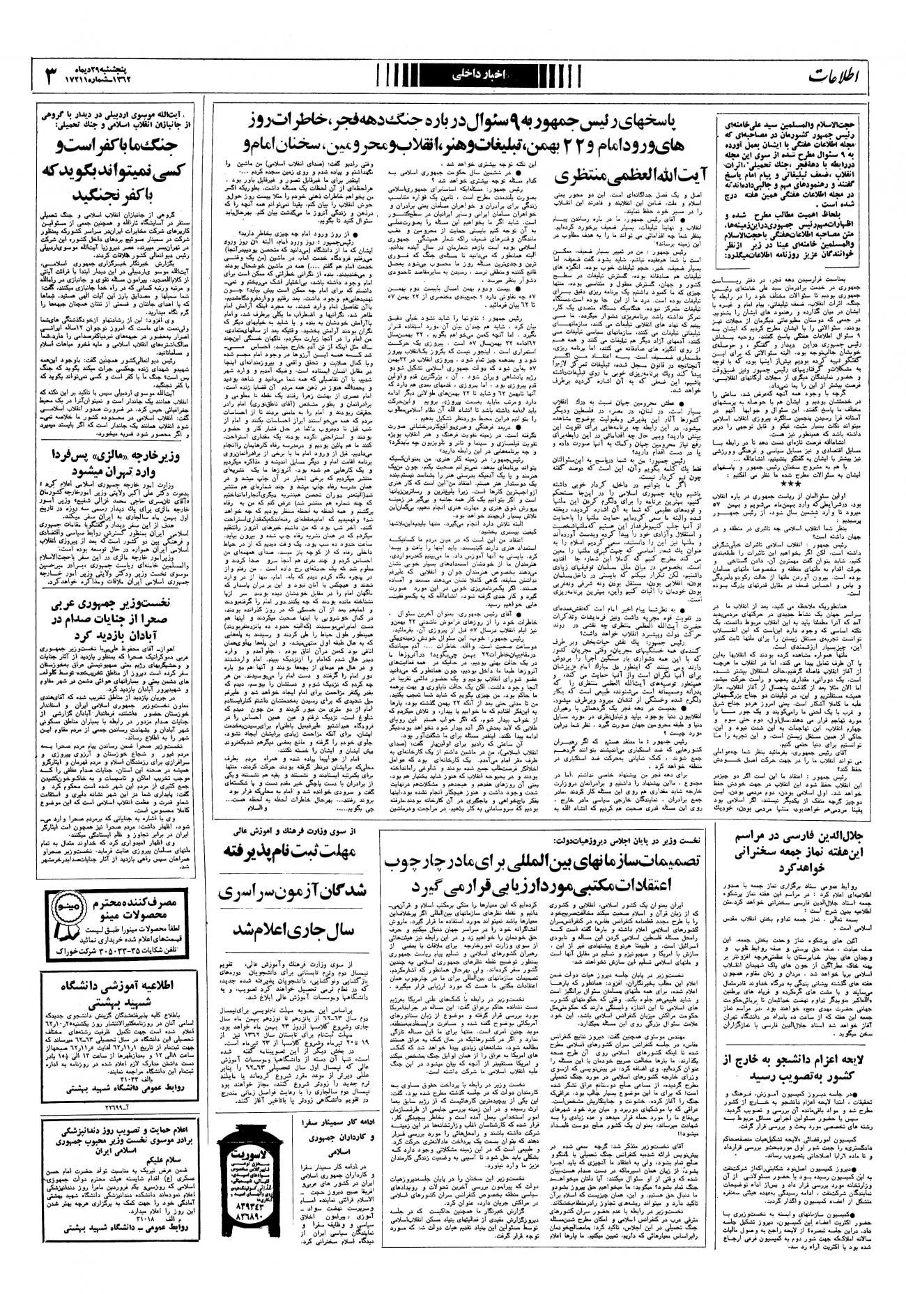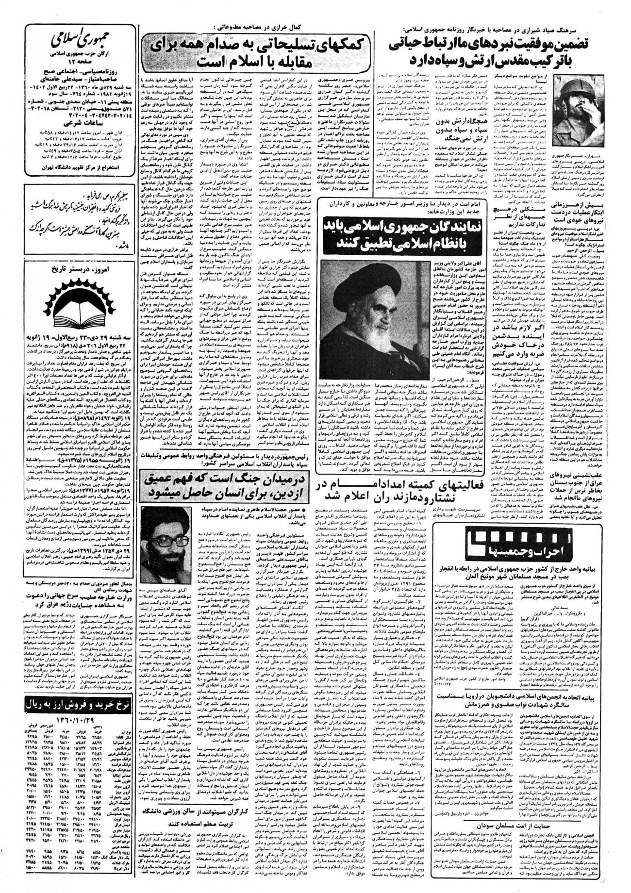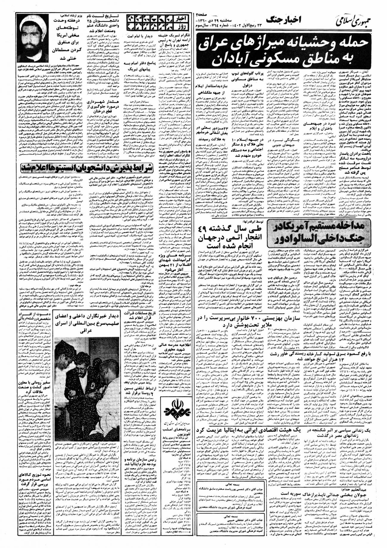 - ۱۳۶۲/۱۰/۲۹ پاسخ های رئیس جمهور به ۹ سئوال درباره جنگ، دهه فجر، خاطرات روزهای ورود امام و ۲۲ بهمن، تبلیغات و هنر انقلاب و محرومین، سخنان امام و آیت الله العظمی منتظری