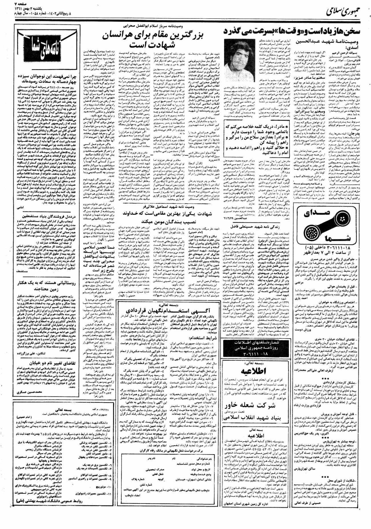 - ۱۳۶۰/۱۱/۳ پیام پدر یک شهید راه اسلام به رئیس جمهور، رئیس مجلس شورای اسلامی ، شورای نگهبان و نخست وزیر جمهوری اسلامی: ترمزکننده های انقلاب را به مردم معرفی کنید