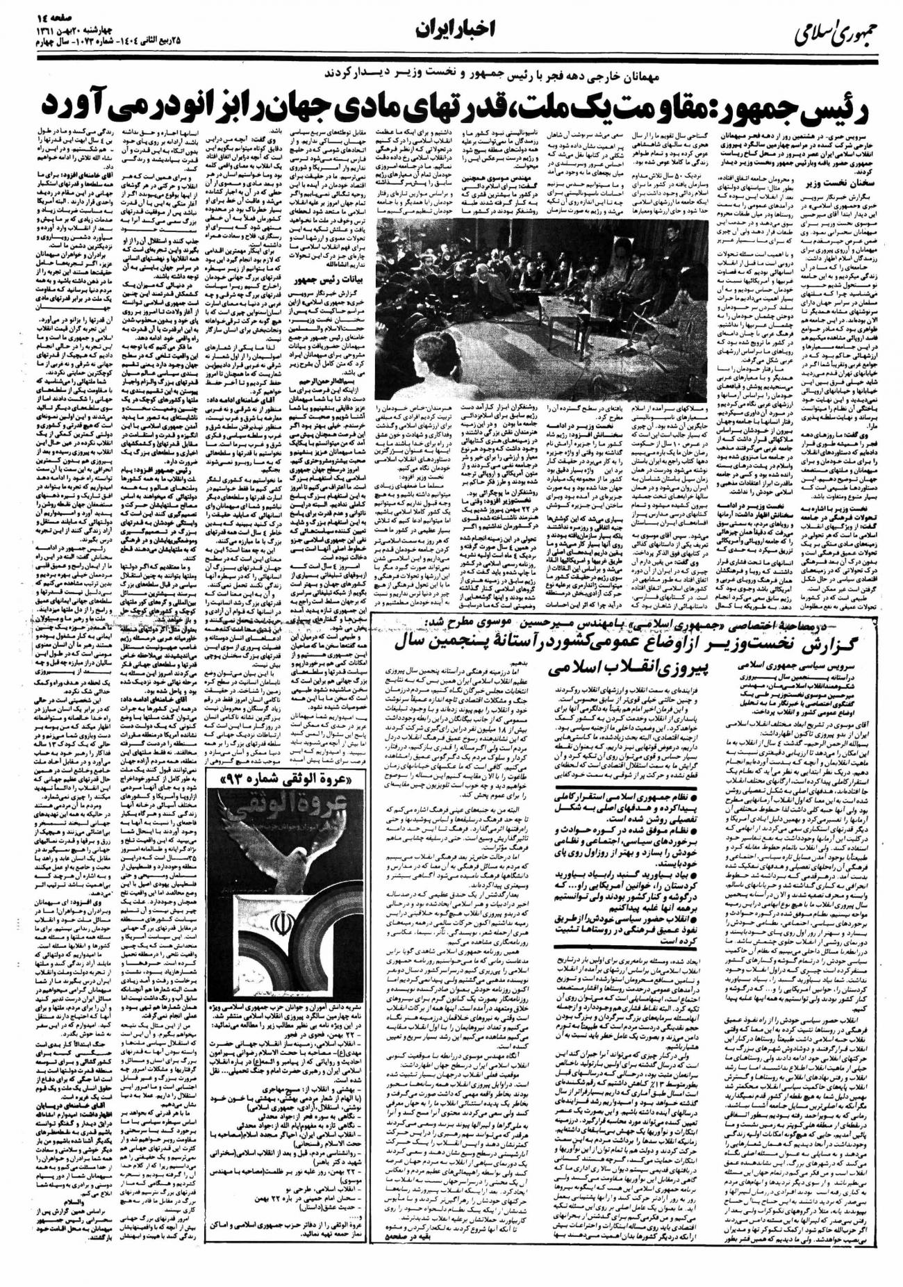 - ۱۳۶۱/۱۱/۲۰ مهمانان خارجی دهه فجر با رئیس جمهور و نخست وزیر دیدار کردند:مقاومت یک ملت،قدرت های مادی جهان را به زانو در می آورد.