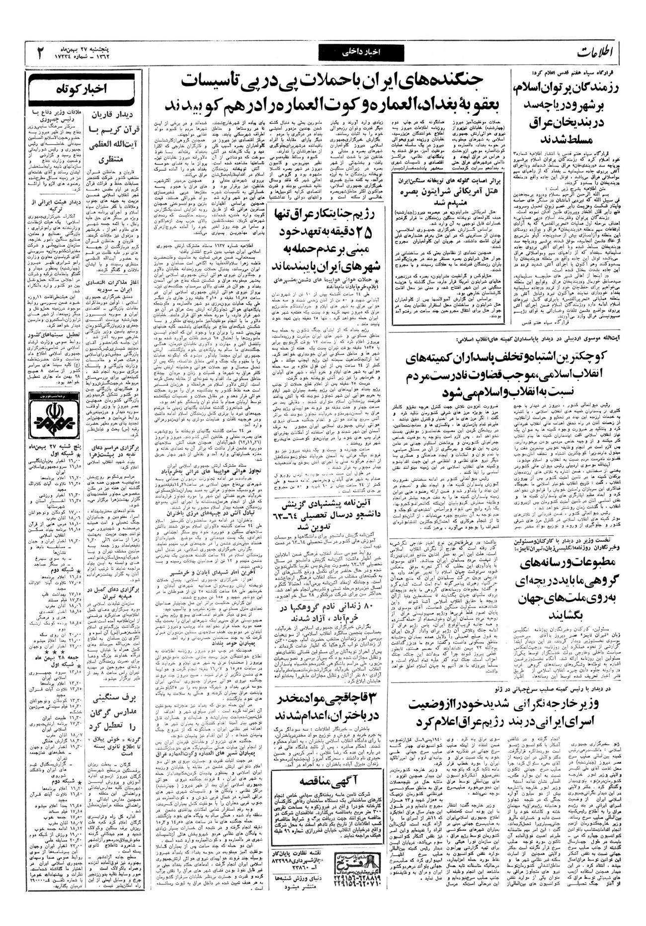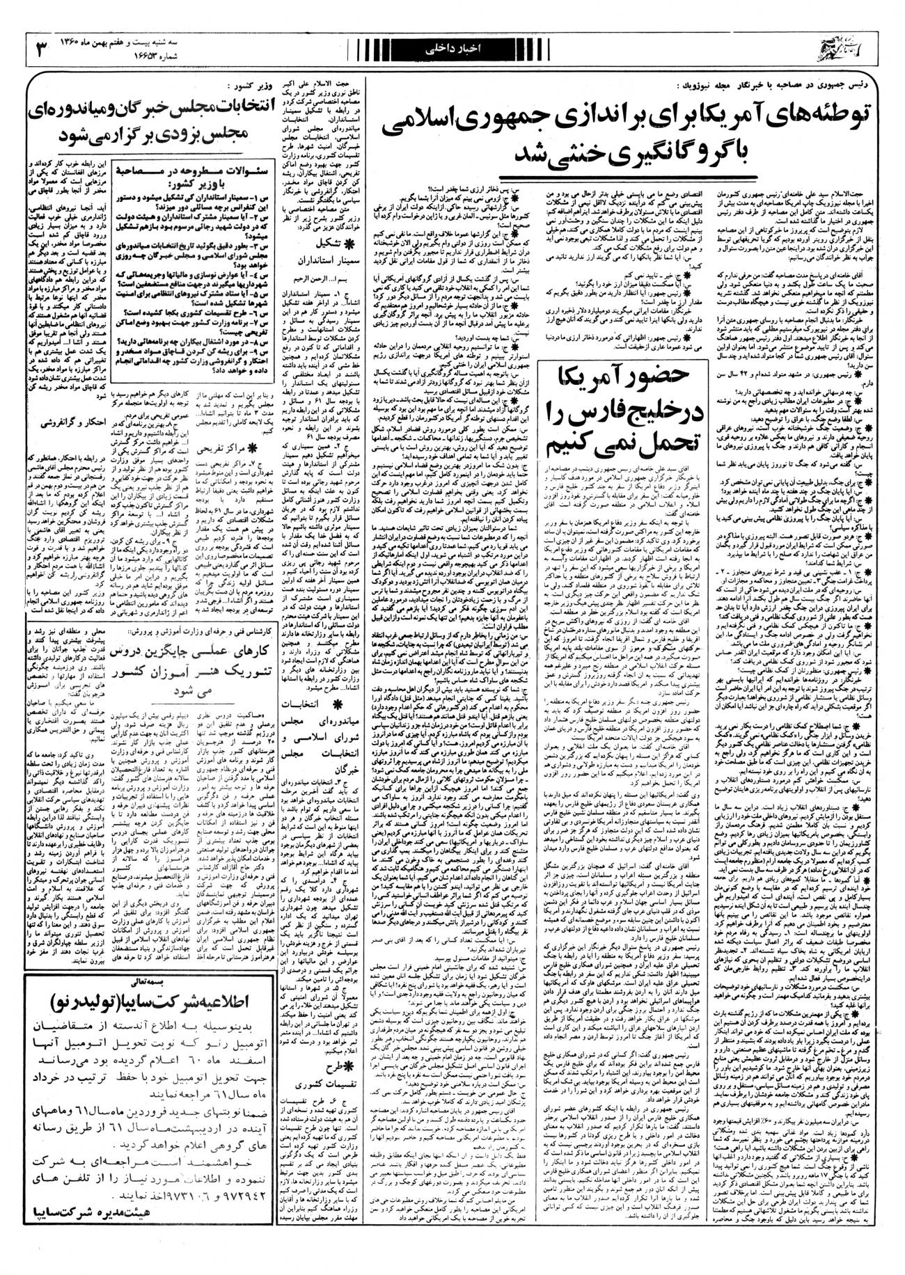 - ۱۳۶۰/۱۱/۲۷ رئیس جمهوری درمصاحبه باخبرنگارمجله نیوزویک:توطئه های آمریکا برای براندازی جمهوری اسلامی باگروگانگیری خنثی شد